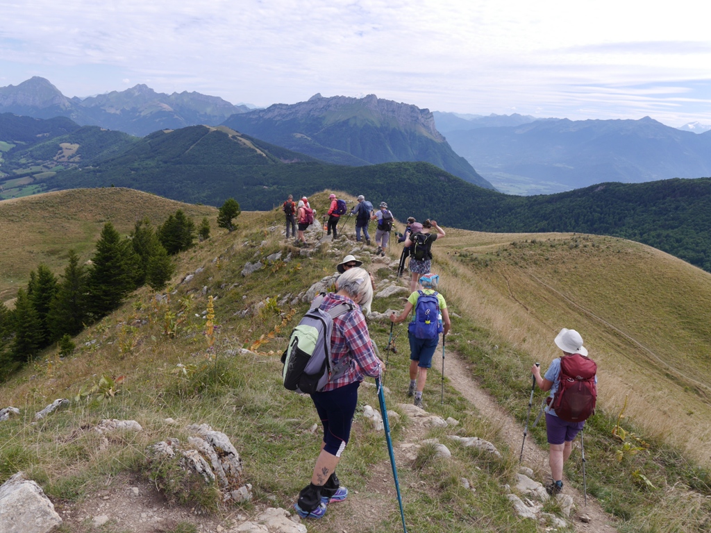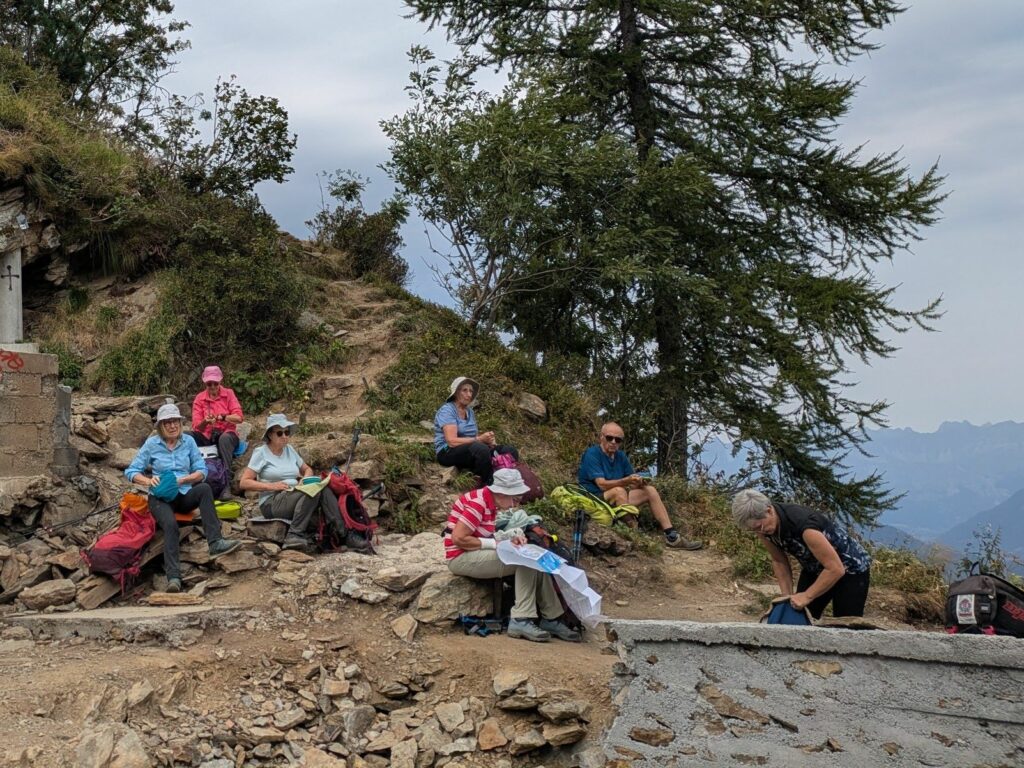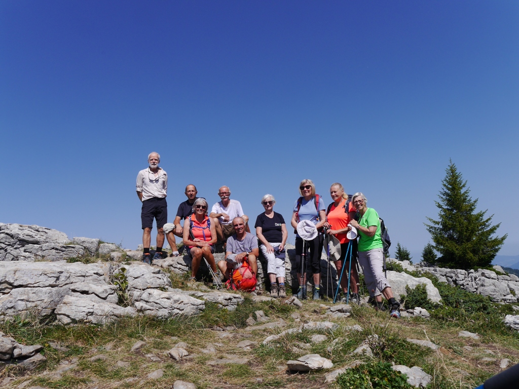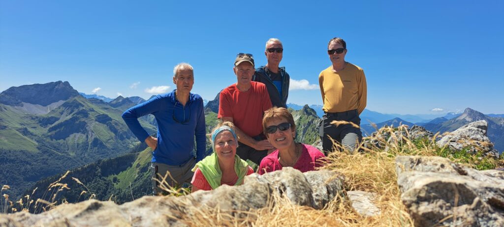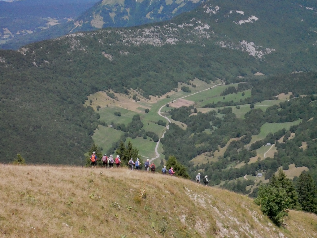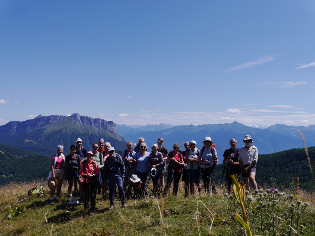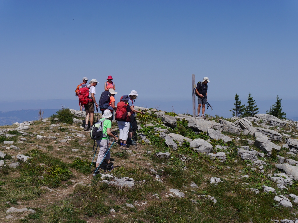 La vue est magnifique, le tour d’horizon est aisé car nous avons déjà pratiqué un grand nombre des chaînes, montagnes et massifs que nous observons : le Bargy, Bellajoux, les Glières, les Auges, la Tournette… La photo de groupe réalisée, nous débutons la descente pour trouver au bout d’une quinzaine de minutes un petit emplacement à l’ombre favorable à la pause méridienne. Le déjeuner tiré du sac est conclu par le partage d’un gâteau aux prunes et un café.
