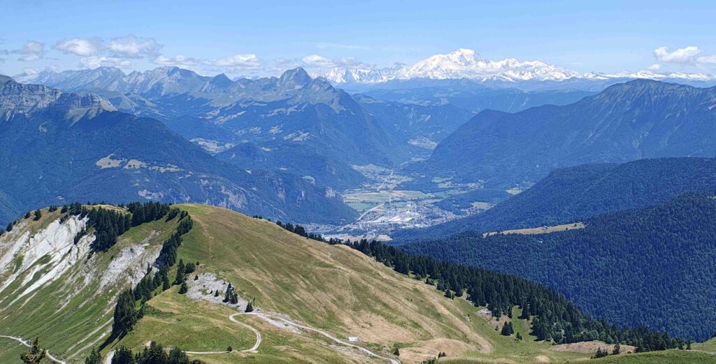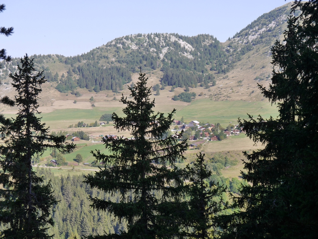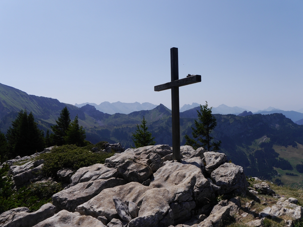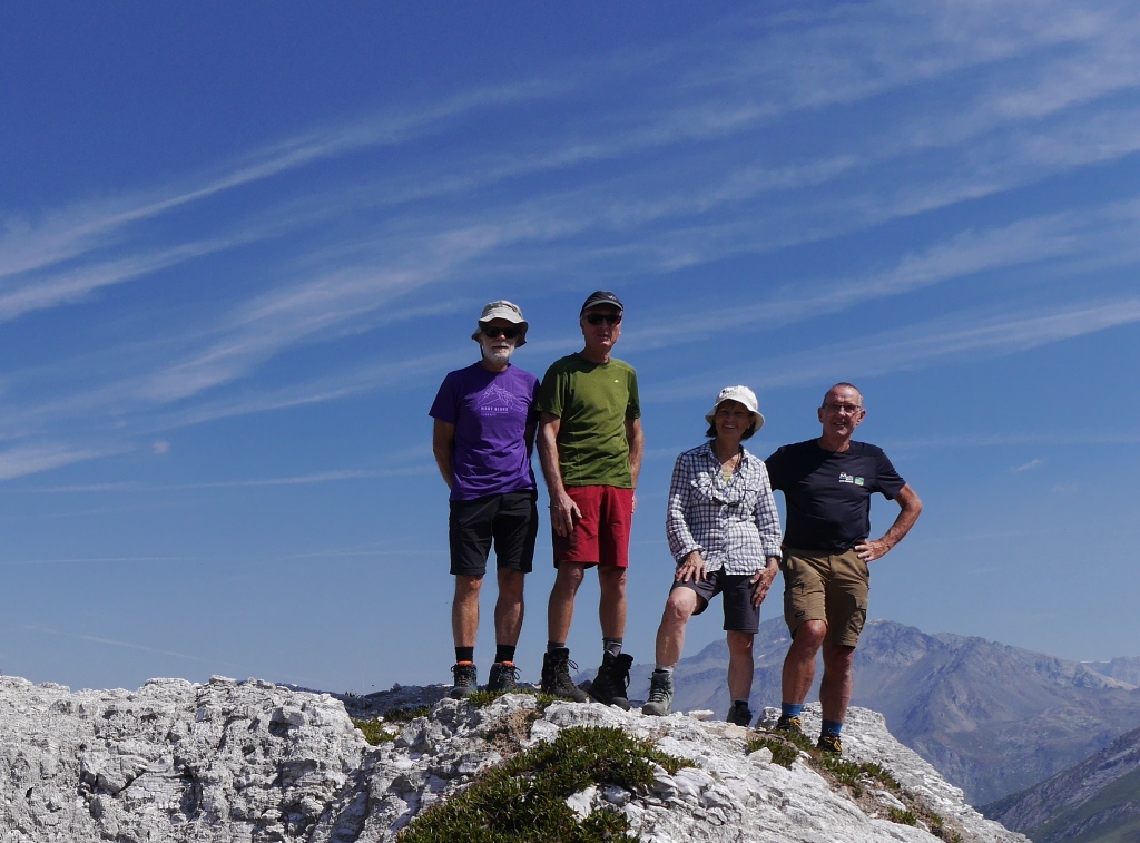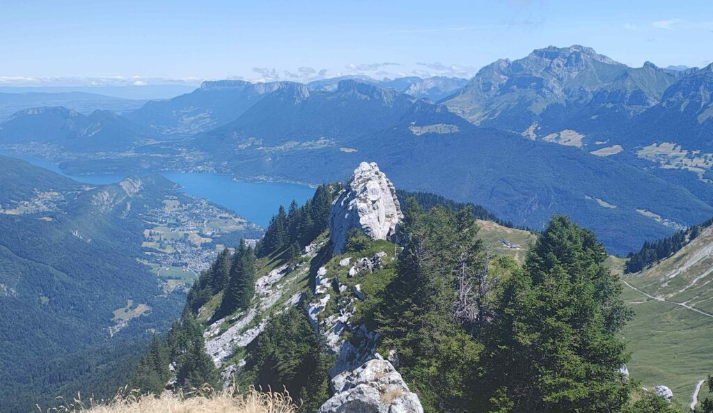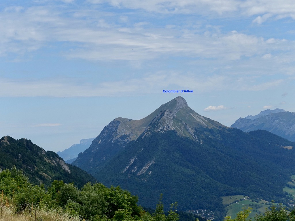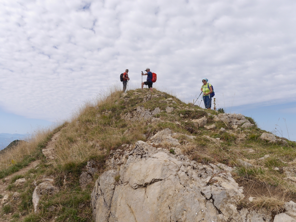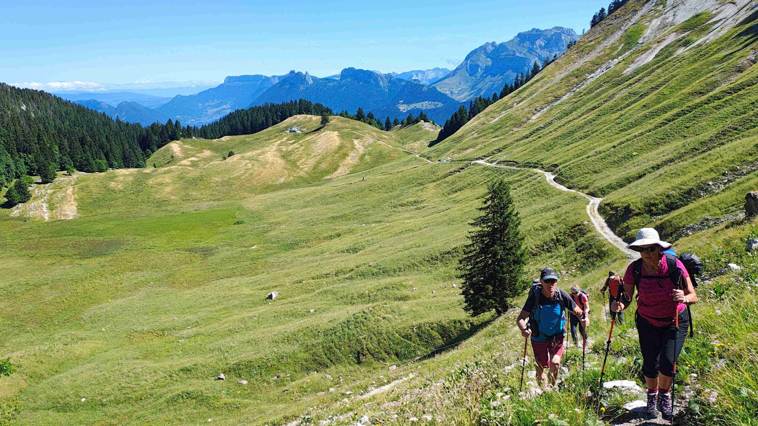 La vue est magnifique, le tour d’horizon est aisé car nous avons déjà pratiqué un grand nombre des chaînes, montagnes et massifs que nous observons : le Bargy, Bellajoux, les Glières, les Auges, la Tournette… La photo de groupe réalisée, nous débutons la descente pour trouver au bout d’une quinzaine de minutes un petit emplacement à l’ombre favorable à la pause méridienne. Le déjeuner tiré du sac est conclu par le partage d’un gâteau aux prunes et un café.