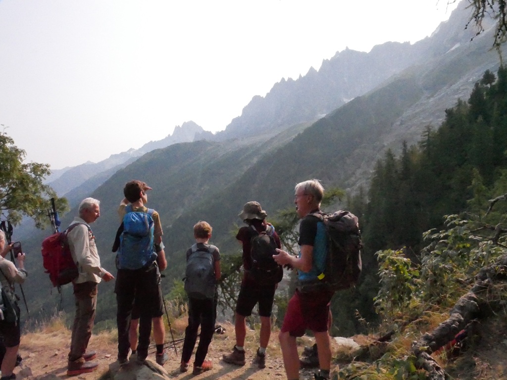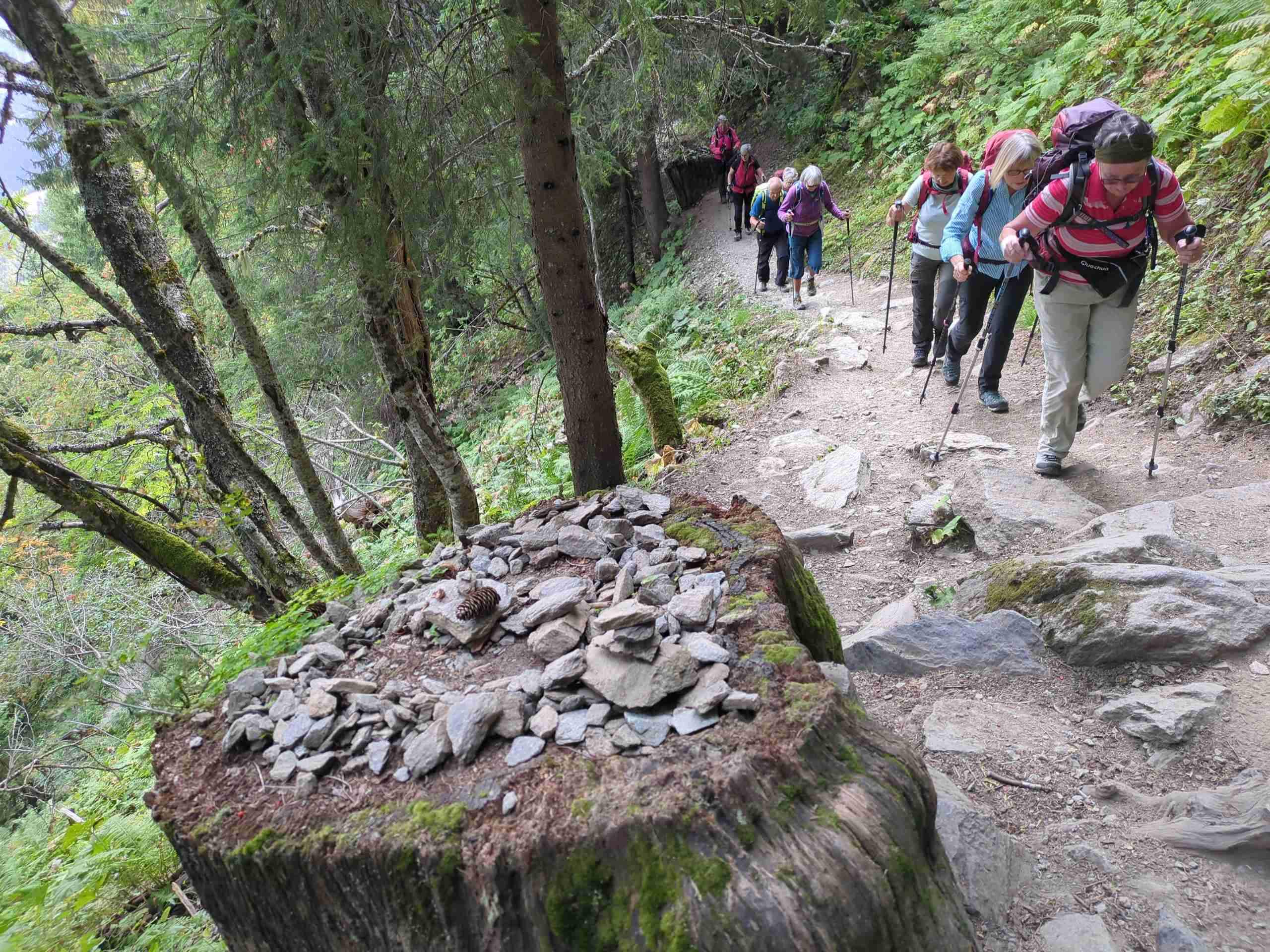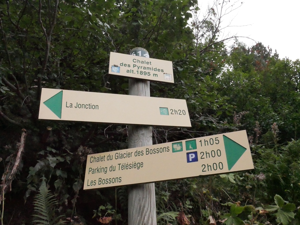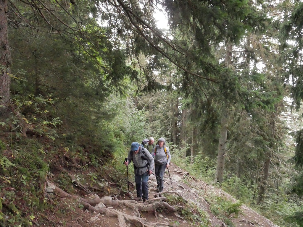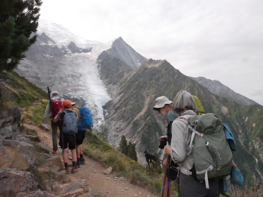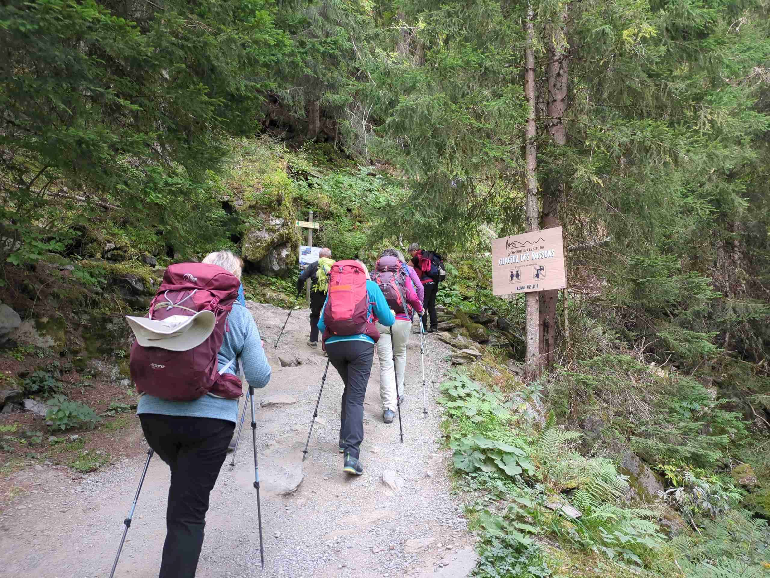 Le groupe « chalet des Pyramides » a un trajet annoncé pour une montée d’1h30 et donc va pouvoir prendre une allure « contemplative ». Le sentier suit d’abord une piste forestière en lacets, offrant un premier point de vue sur la vallée, avant de s’élever progressivement.  Des trouées dans les bois permettent des points de vue grandioses sur les séracs d’un côté du glacier de Taconnaz et de l’autre du glacier des Bossons .