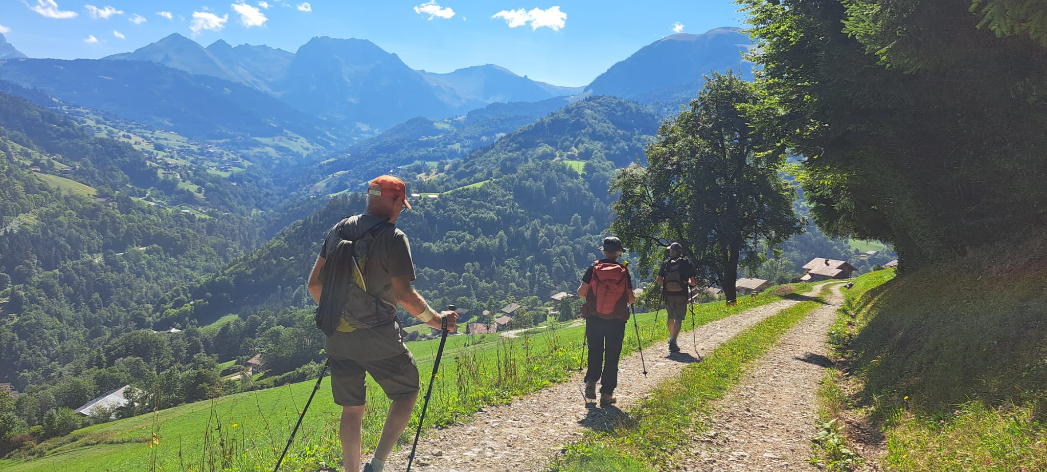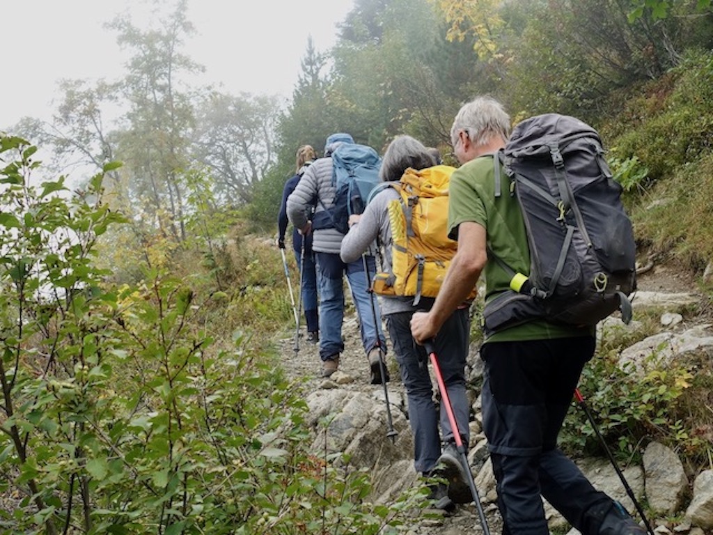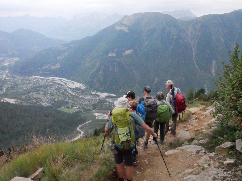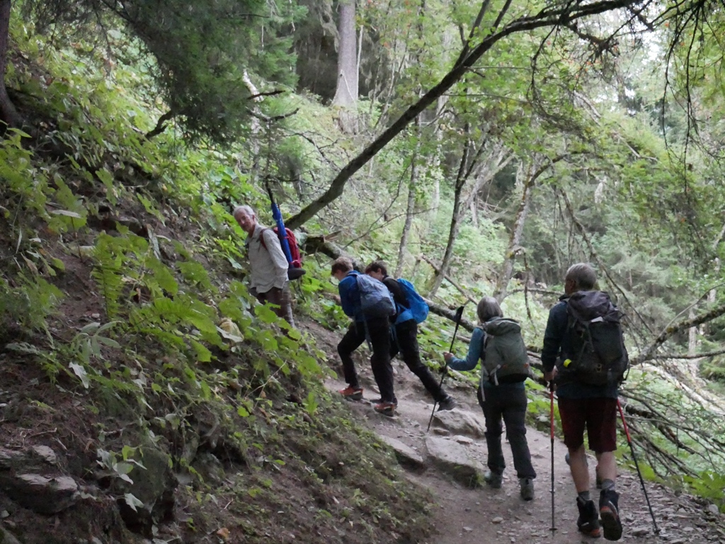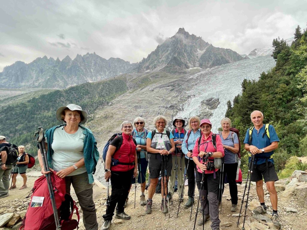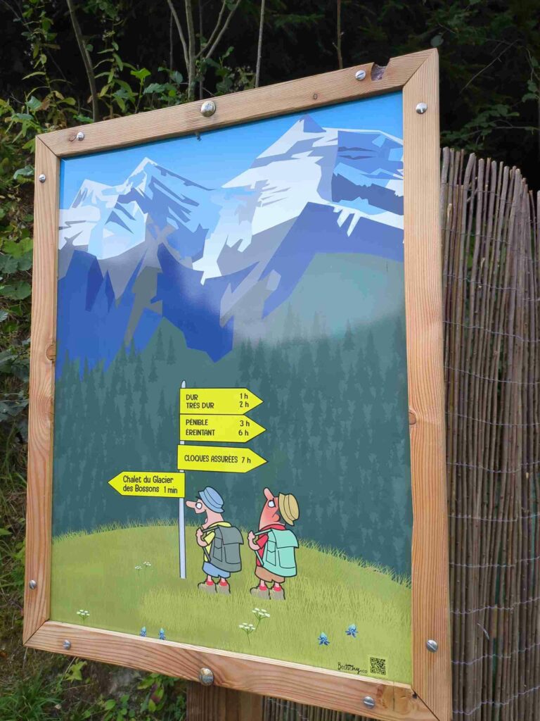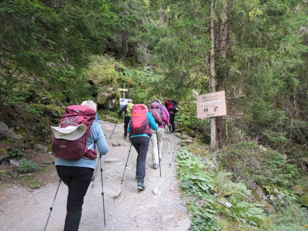 Le groupe « chalet des Pyramides » a un trajet annoncé pour une montée d’1h30 et donc va pouvoir prendre une allure « contemplative ». Le sentier suit d’abord une piste forestière en lacets, offrant un premier point de vue sur la vallée, avant de s’élever progressivement.  Des trouées dans les bois permettent des points de vue grandioses sur les séracs d’un côté du glacier de Taconnaz et de l’autre du glacier des Bossons .