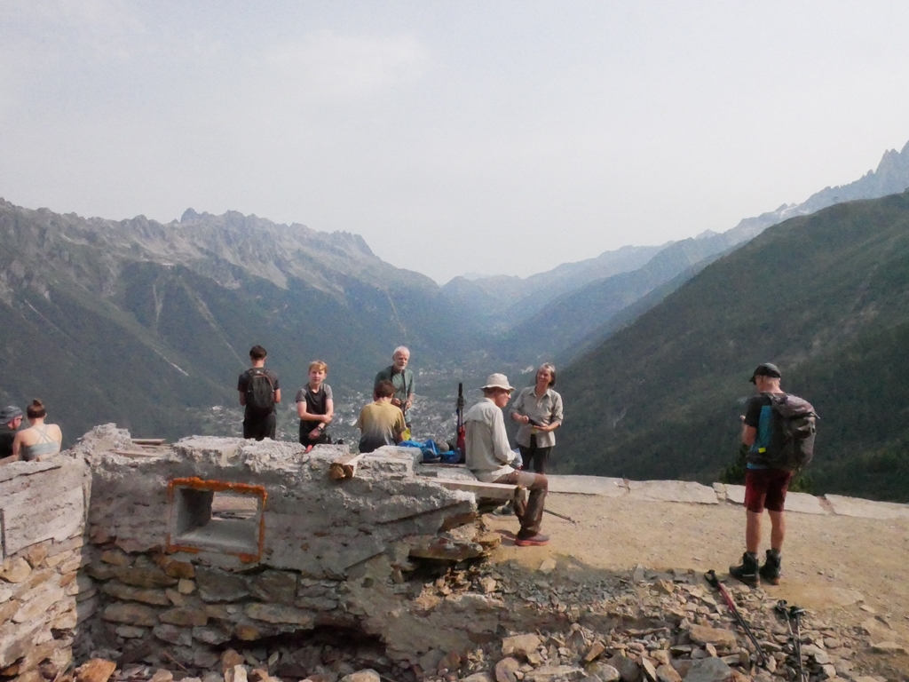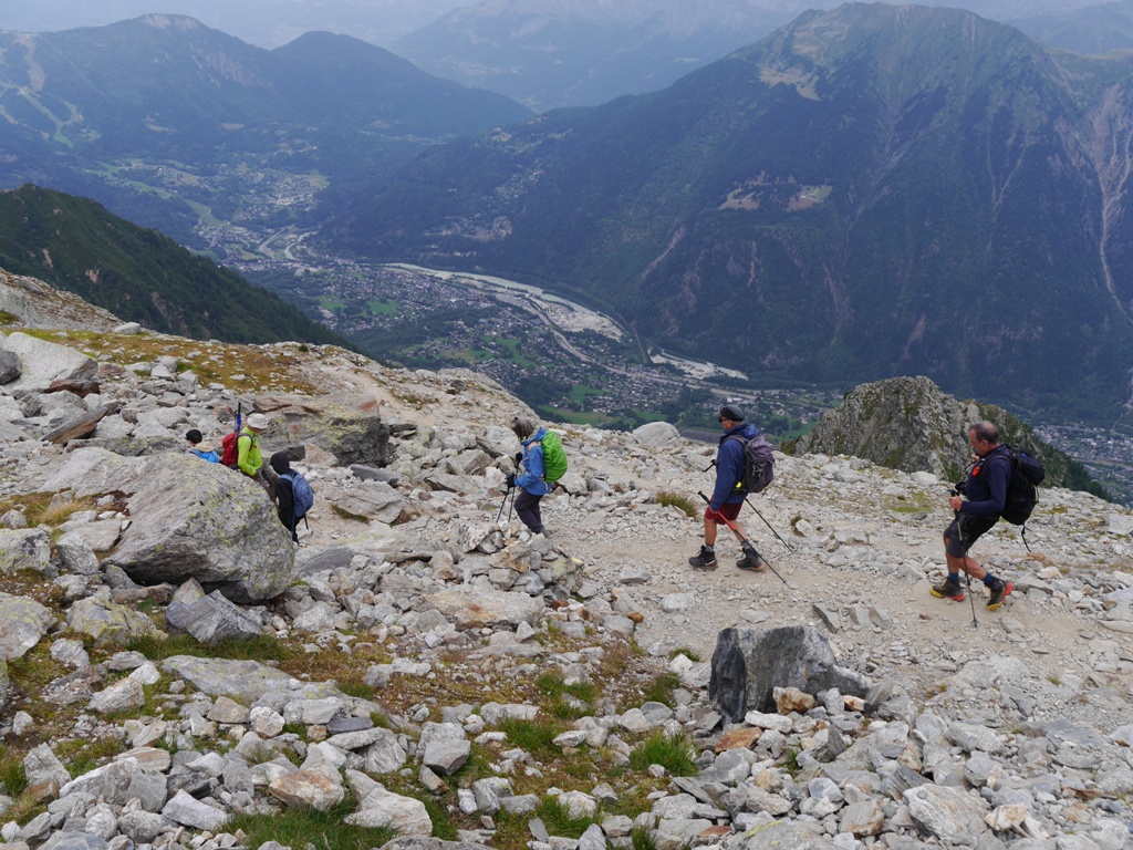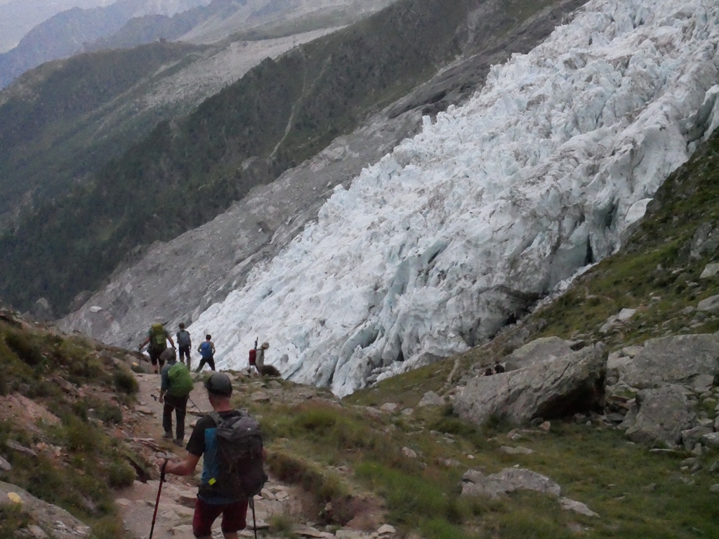 Puis il va emprunter une ligne de crête au-dessus du glacier, avec des passages rocheux et des ascensions verticales. Il suit l’itinéraire emprunté par Jacques Balmat et le docteur Paccard lors de la première ascension du Mont-Blanc en 1786. Le temps annoncé est environ 4 h aller depuis le chalet des Bossons. La marche est bien sportive: la météo risquant de tourner et l’attente du premier groupe leur met la pression. Ils ont leurs efforts récompensés par la rencontre avec la limite du glacier qui est désormais à cette altitude.