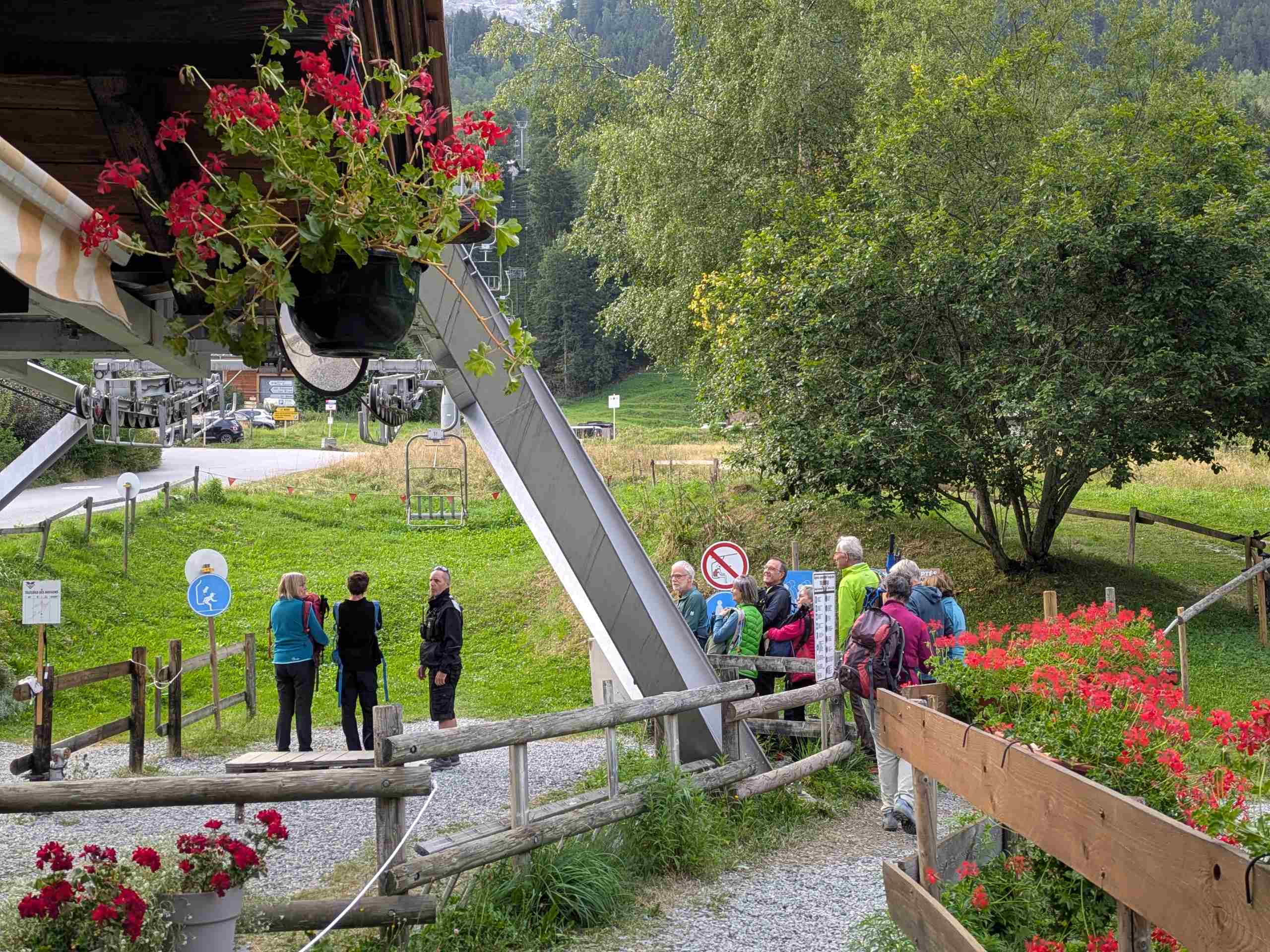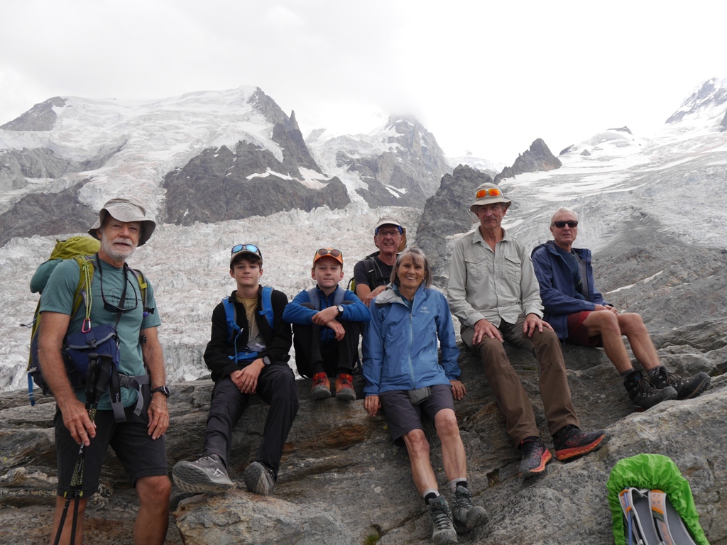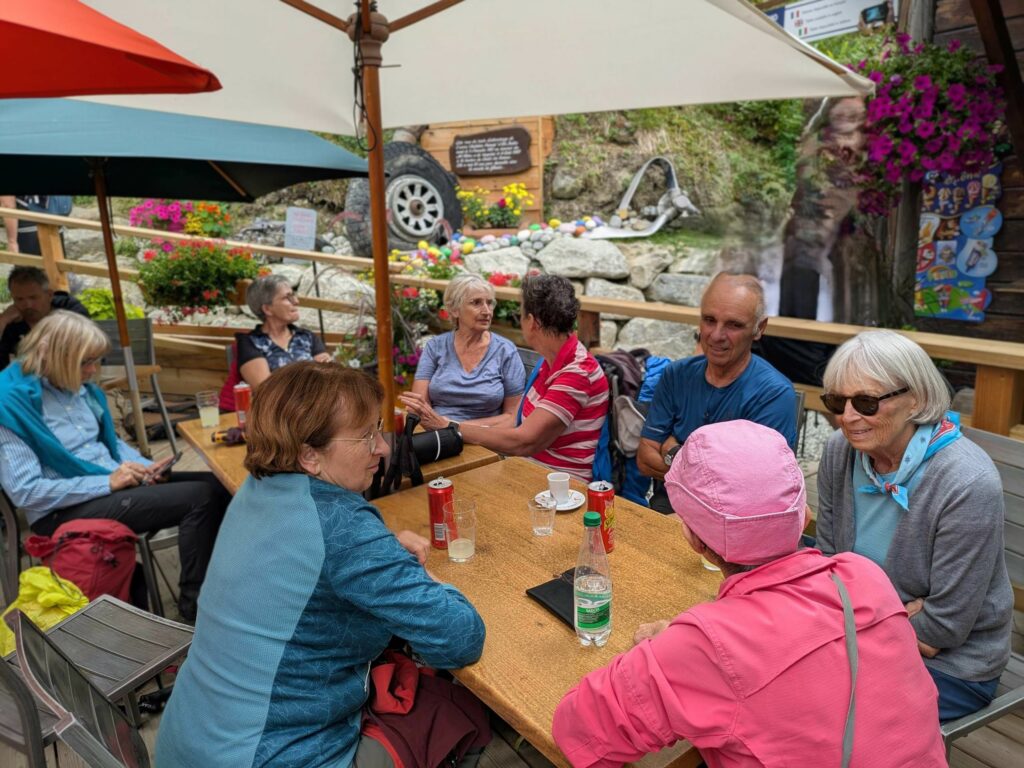 Nous atteignons le chalet des Pyramides vers 11h45. La tempête de mars 2024 a endommagé cette buvette datant de 1904 et située à 1 895 m d’altitude sur l’itinéraire de la Jonction. Les dommages et le terrain trop instable ont empêché toute réparation, contraignant la commune à démonter les restes du chalet.  Nous avons toutefois pique-niqué sur la plateforme restante dans ce cadre qui offre une vue saisissante sur la cascade des séracs du glacier et où nous faisons notre photo de groupe.