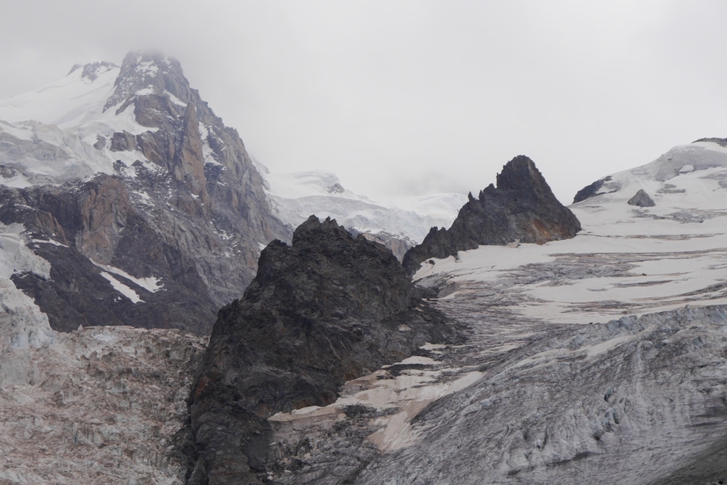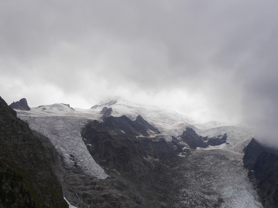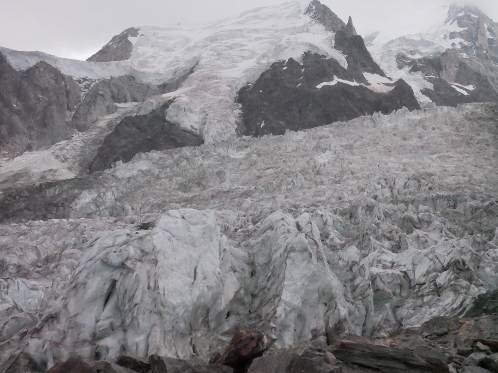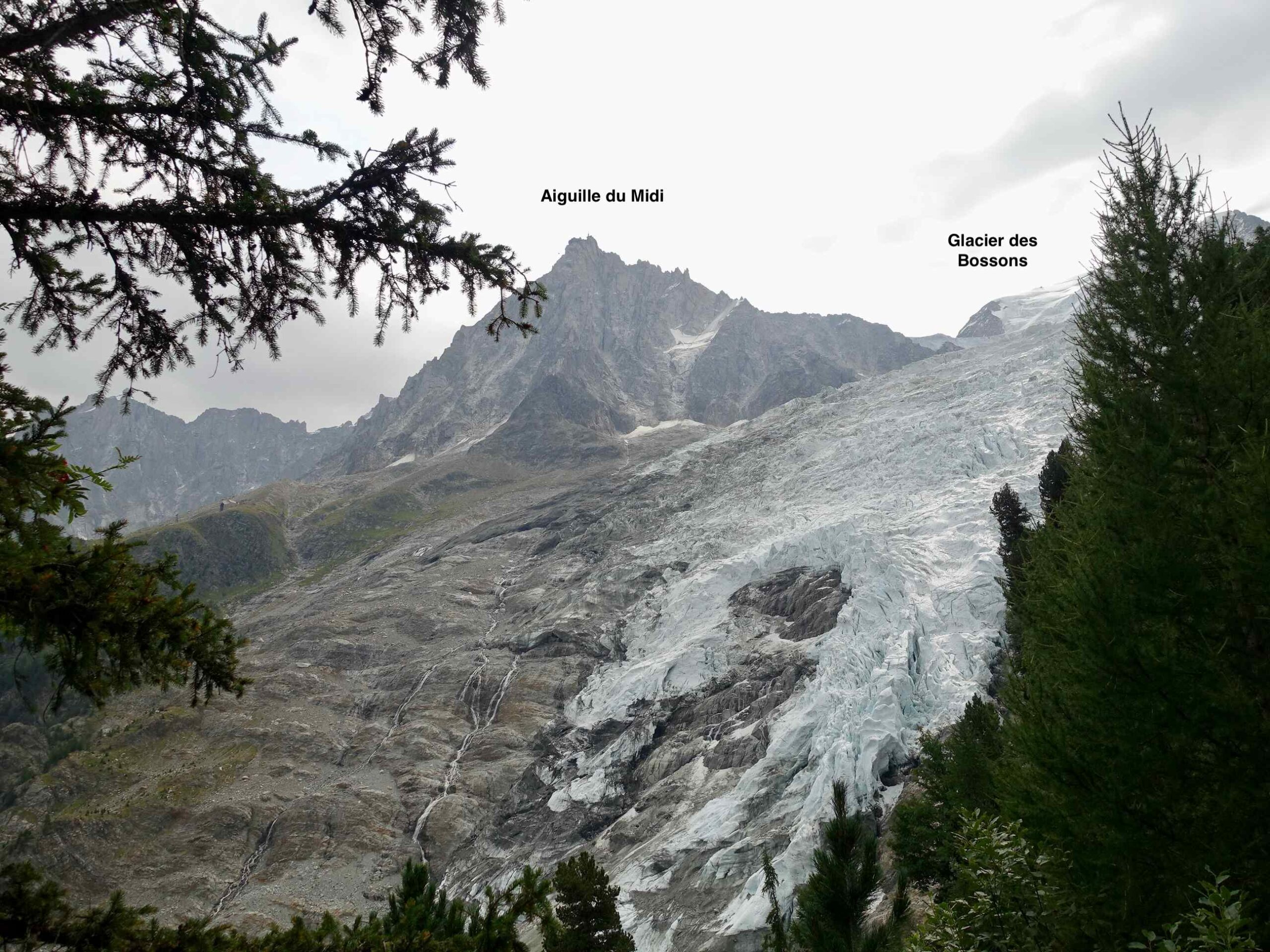 Des nuages s’amoncelant et quelques gouttes de pluie se faisant sentir, nous entreprenons la descente vers 13h. La descente se fait sans problèmes. La pluie s’étant arrêtée, nous avons rangé nos capes avec plaisir. Nous devons encore laisser passer de nombreux trailers pressés. Nous atteignons le Chalet des Glaciers des Bossons vers 14h40.