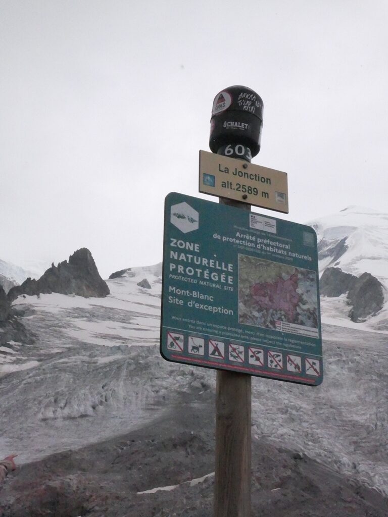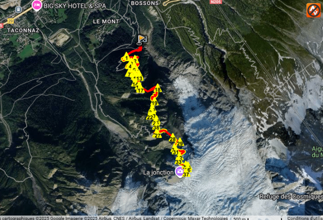 Il est 8h50, le groupe qui part à la Jonction à 2589 m embraye rapidement. Leur itinéraire va en direction du chalet des Pyramides puis va emprunter une ligne de crête au-dessus du glacier, avec des passages rocheux et des ascensions verticales. Il suit l’itinéraire emprunté par Jacques Balmat et le docteur Paccard lors de la première ascension du Mont-Blanc en 1786. Le temps annoncé est environ 4 h aller depuis le chalet des Bossons.