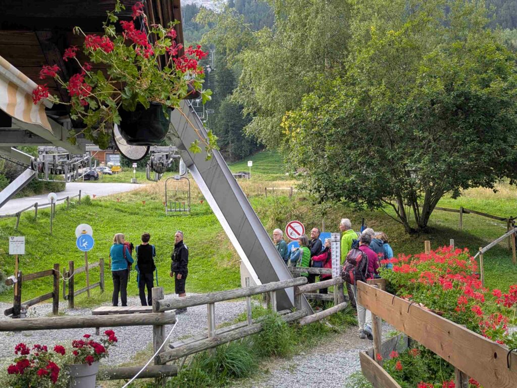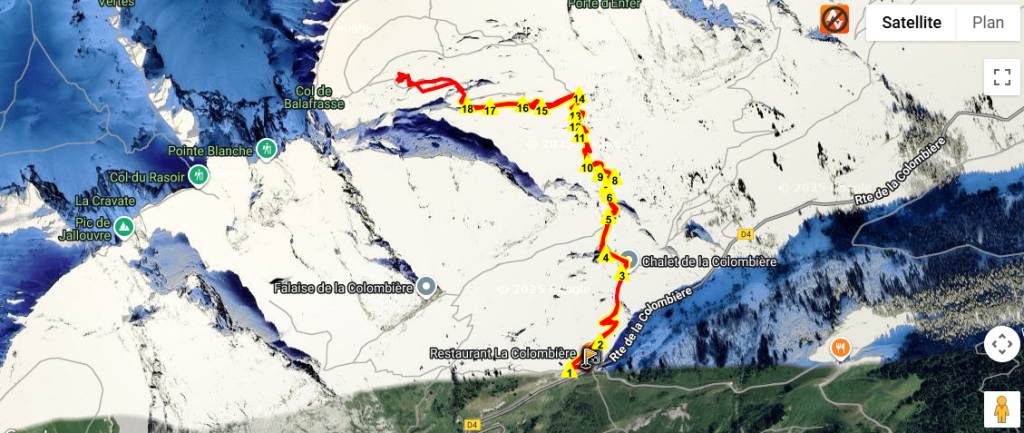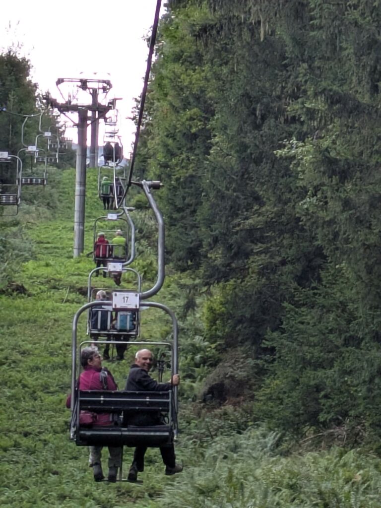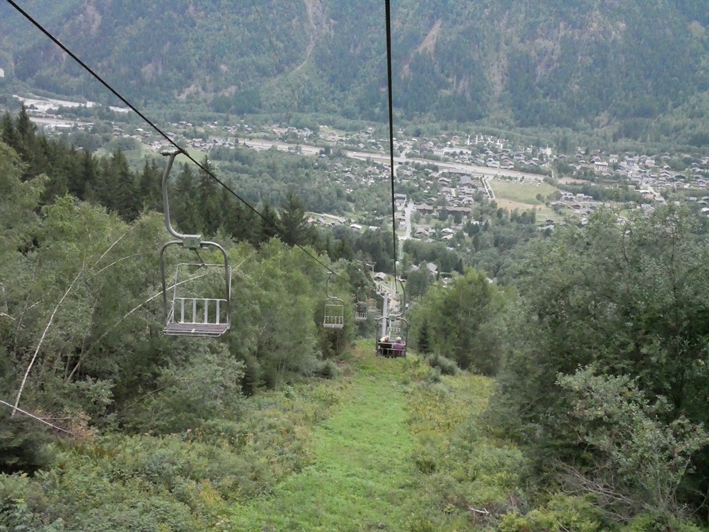 Nous nous retrouvons tous au parking du télésiège du Glacier des Bossons, juste pour l’ouverture des montées à 8h30. Ce télésiège relie en 15 min l’altitude de 1 036 mètres à 1 405 m, sur une longueur de 1 103 m, avec une dénivellée de 369 m. C’est un télésiège fixe biplace construit en 1960 (et rénové ensuite) à l’initiative du champion de ski James Couttet, ce qui en fait le doyen des télésièges biplaces Poma en France. Malgré une petite appréhension pour certains vu le côté « vintage », le trajet se passe sans encombre.