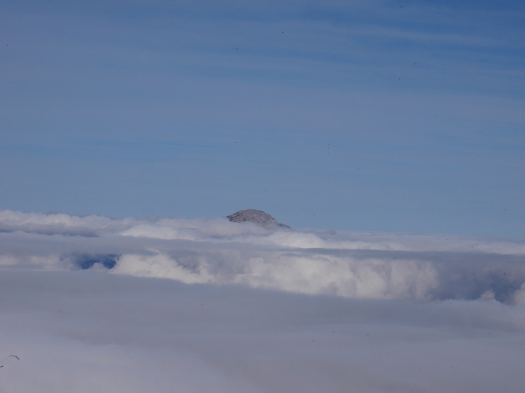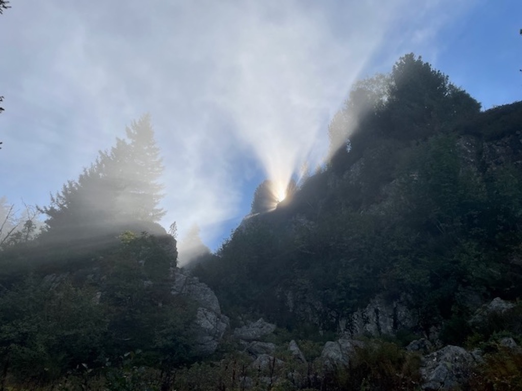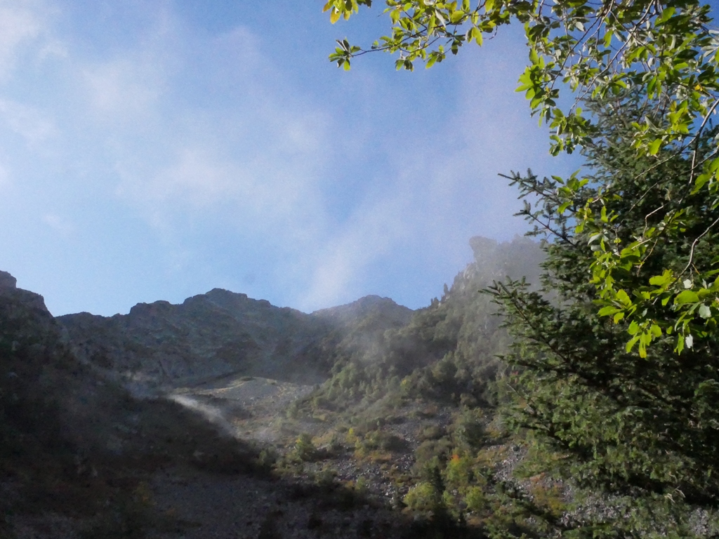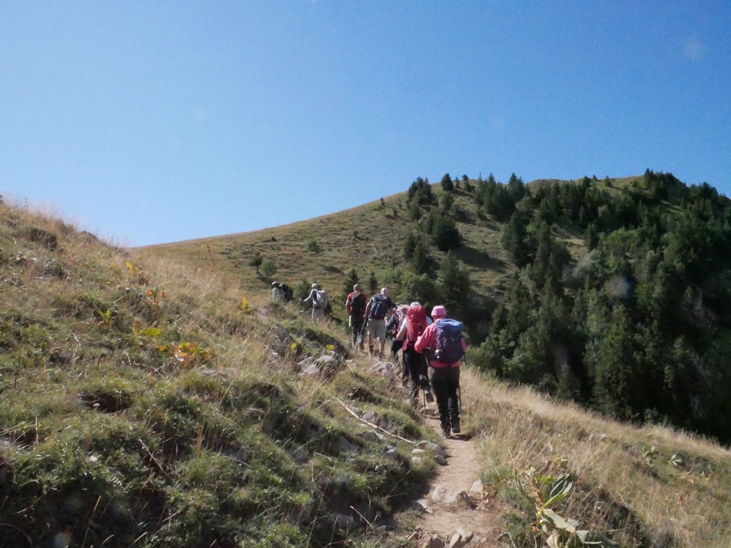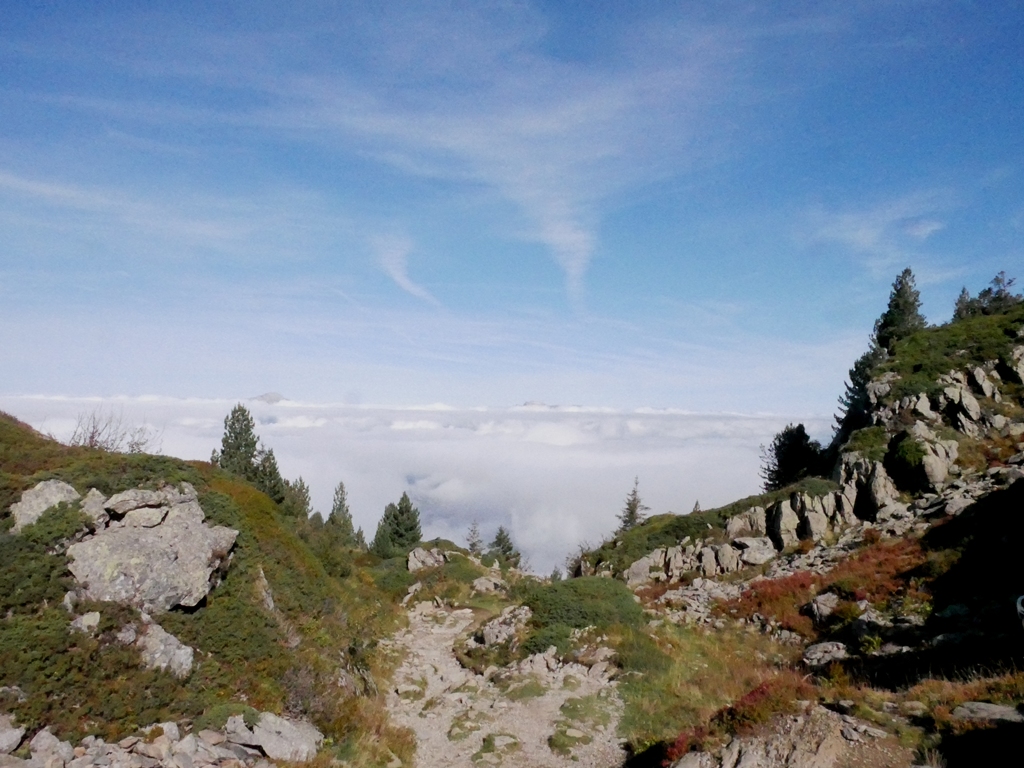 Enfin le ciel s’éclaircit et c’est une douce chaleur qui s’installe pour ce début d’après-midi et notre descente. Ce soleil est notre bienfaiteur car il va assécher assez vite notre terrain de jeu et les inquiétudes de la montée matinale en prévision d’une descente difficile seront vite oubliées. L’attention est toutefois de mise car le sentier n’offre pas toujours les bons appuis, chacun restera concentré comme il se doit pour éviter toute chute.