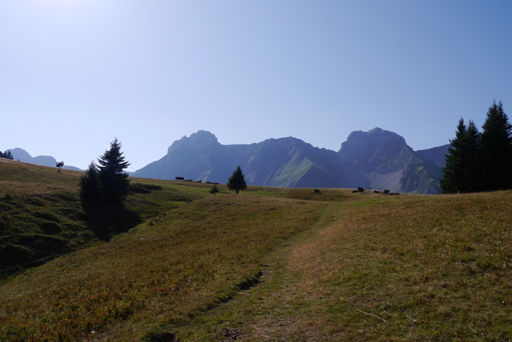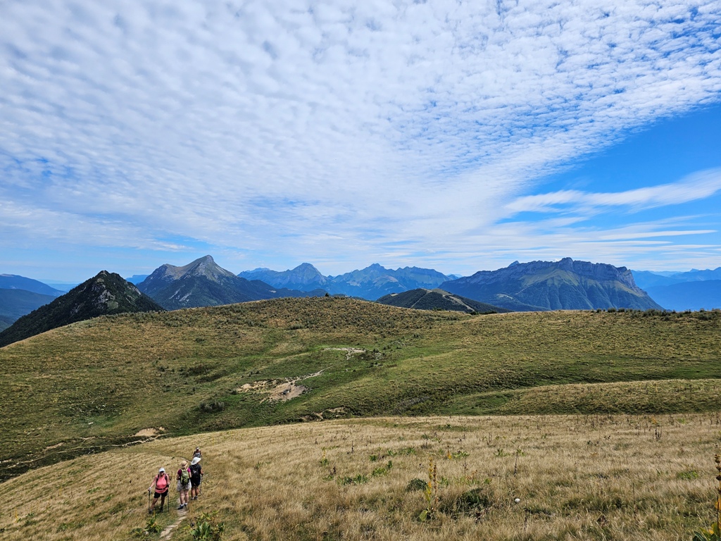 10h03 ! Carrefour « Le Planet Nord – 1695m ». Nous débouchons sur un vaste plateau d’Alpage. Nous reconnaissons l’itinéraire d’une journée « beignets », où nous avions déjeuné au chalet de Cenise, l’occasion est donnée de se rappeler de bons moments de convivialité.