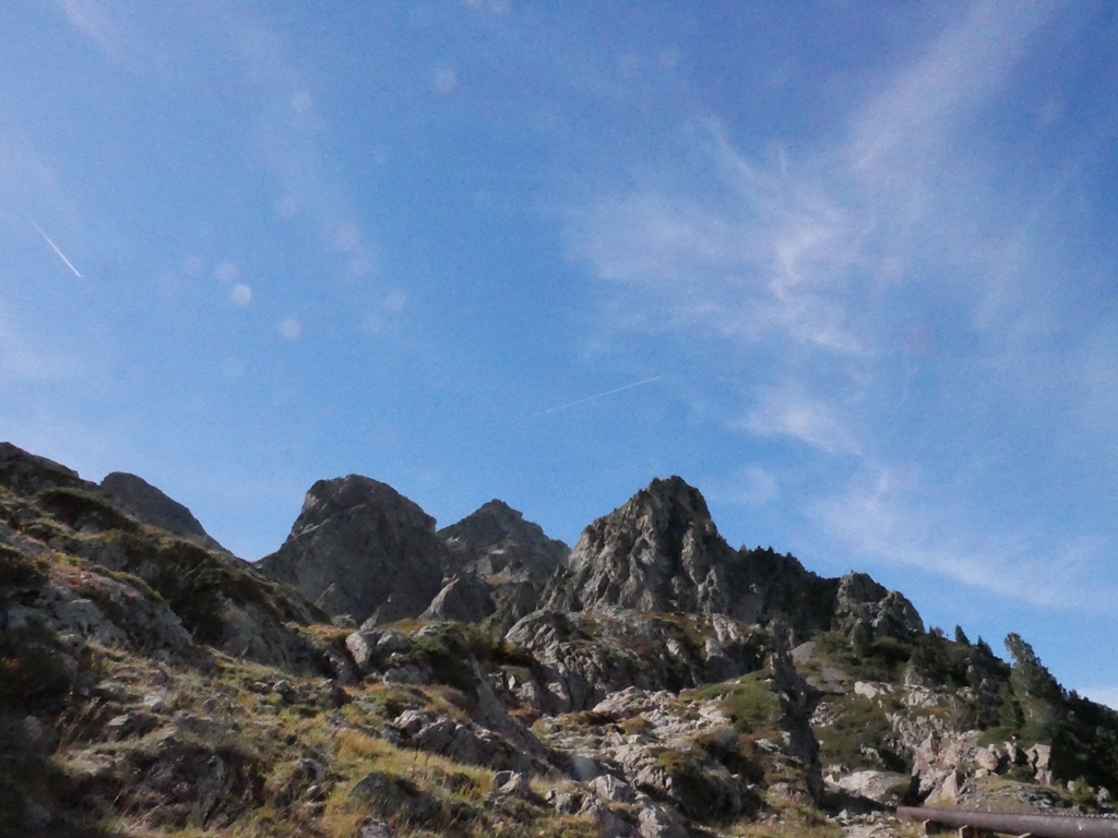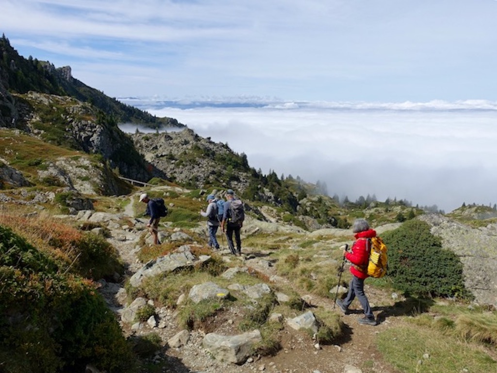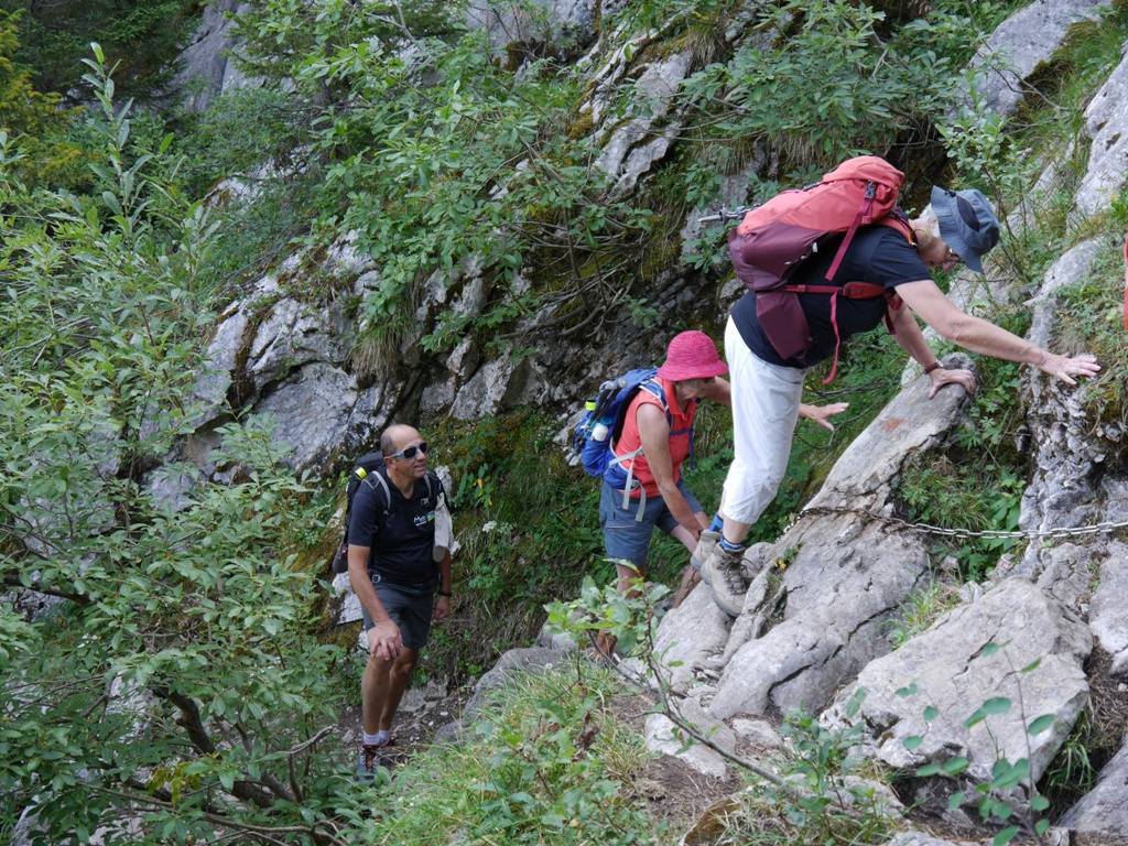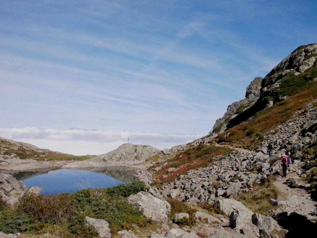 La sente est parfois pentue, les bâtons sont fixés sur le sac à dos, car quelques passages nécessitent de mettre les mains sur les rochers pour assurer la marche et quelques chaînes nous aident aussi pour le franchissement des passages cités supra. Quelques cairns jalonnent ici et là l’itinéraire, ils seront régulièrement disposés pendant toute la journée, sur des portions de sentiers un peu incertaines.