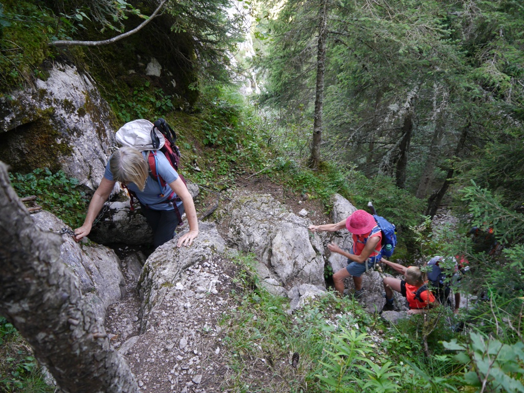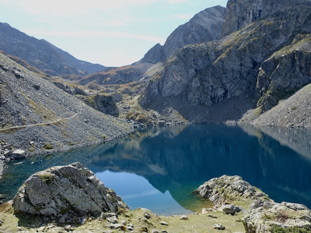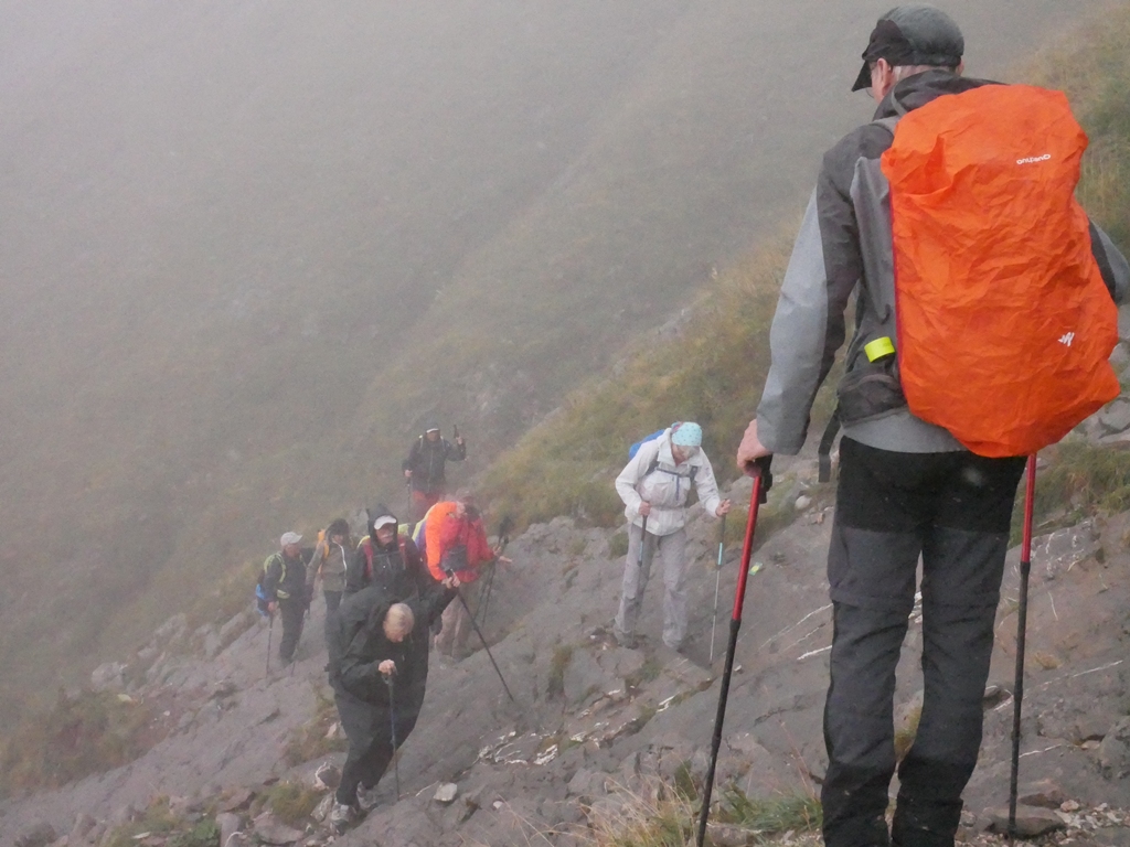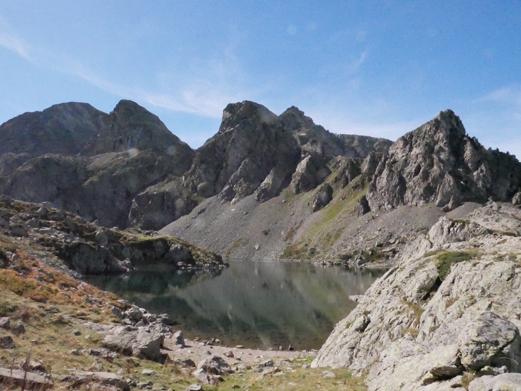 La sente est parfois pentue, les bâtons sont fixés sur le sac à dos, car quelques passages nécessitent de mettre les mains sur les rochers pour assurer la marche et quelques chaînes nous aident aussi pour le franchissement des passages cités supra. Quelques cairns jalonnent ici et là l’itinéraire, ils seront régulièrement disposés pendant toute la journée, sur des portions de sentiers un peu incertaines.