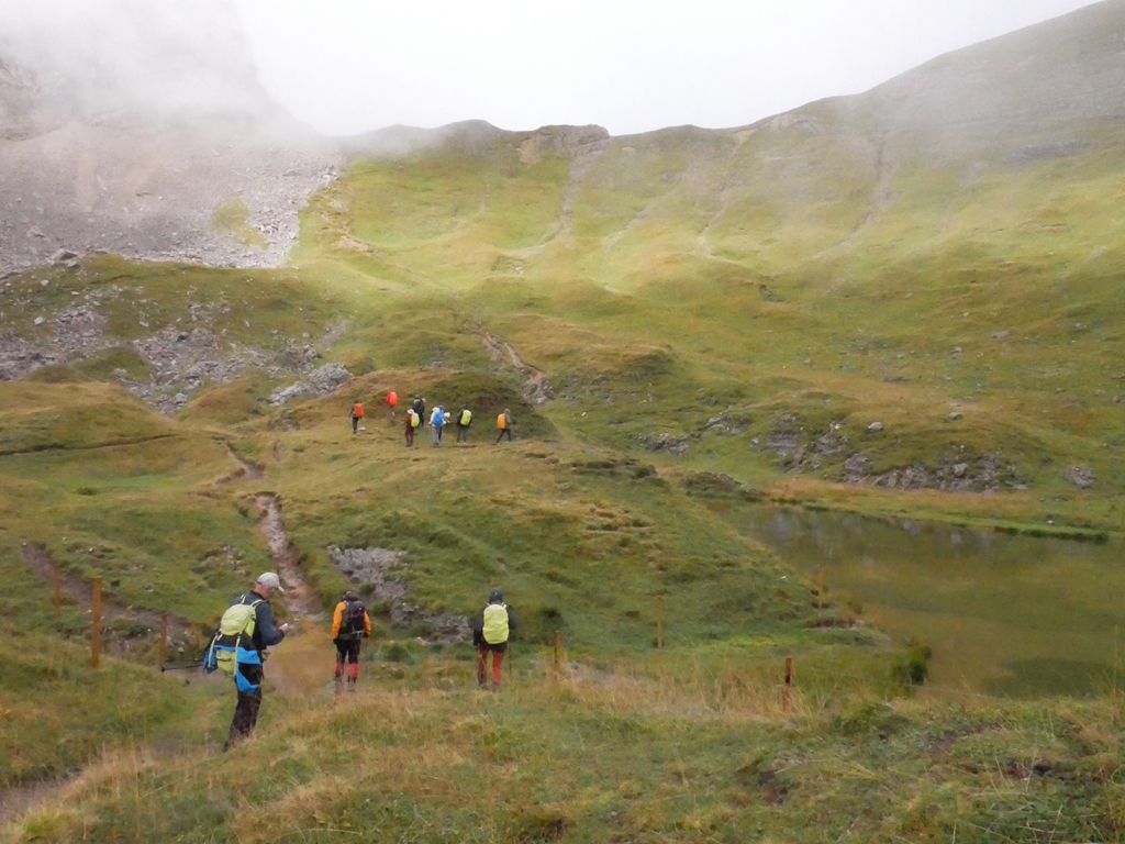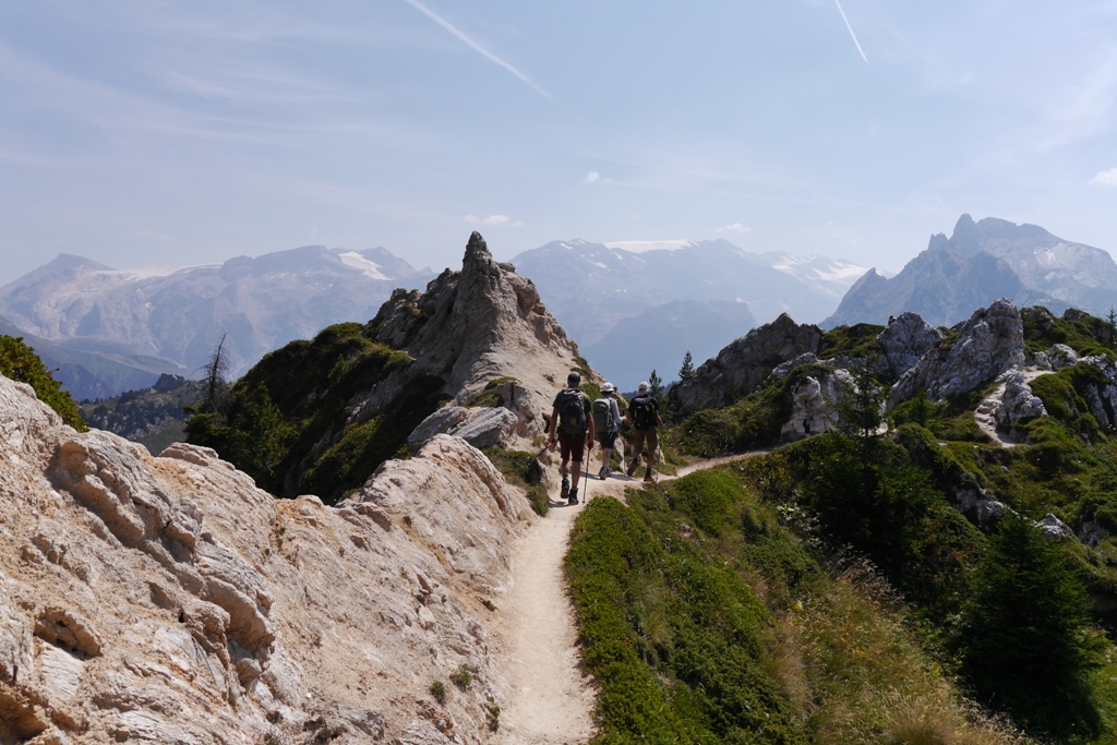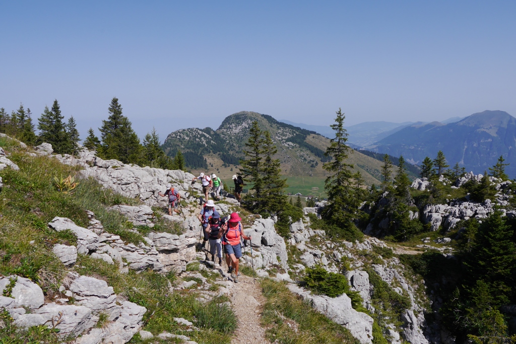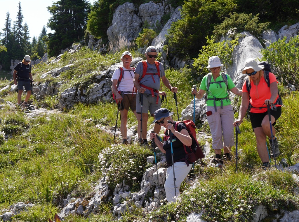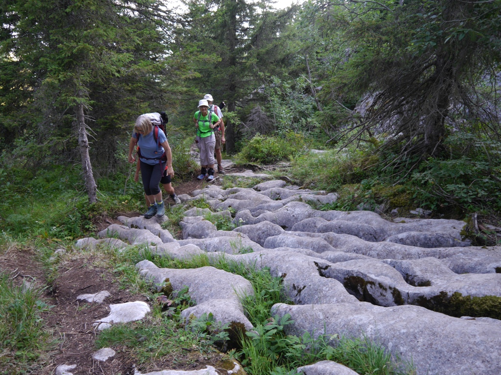 13h00 Nous reprenons notre itinéraire de descente. Il sera délicat pendant une grande partie, alternant zones de lapiaz, pierriers, sentiers mêlant petits blocs rocheux et pierres… le tout sous un soleil généreux ! L’attention est soutenue, comme l’effort nécessaire pour assurer une descente la plus sereine possible, et mises à part de rares glissades, elle permettra somme toute à chacun de rejoindre le plateau de Solaison vers 15h00, heureux d’avoir pu passer une belle journée au grand air.