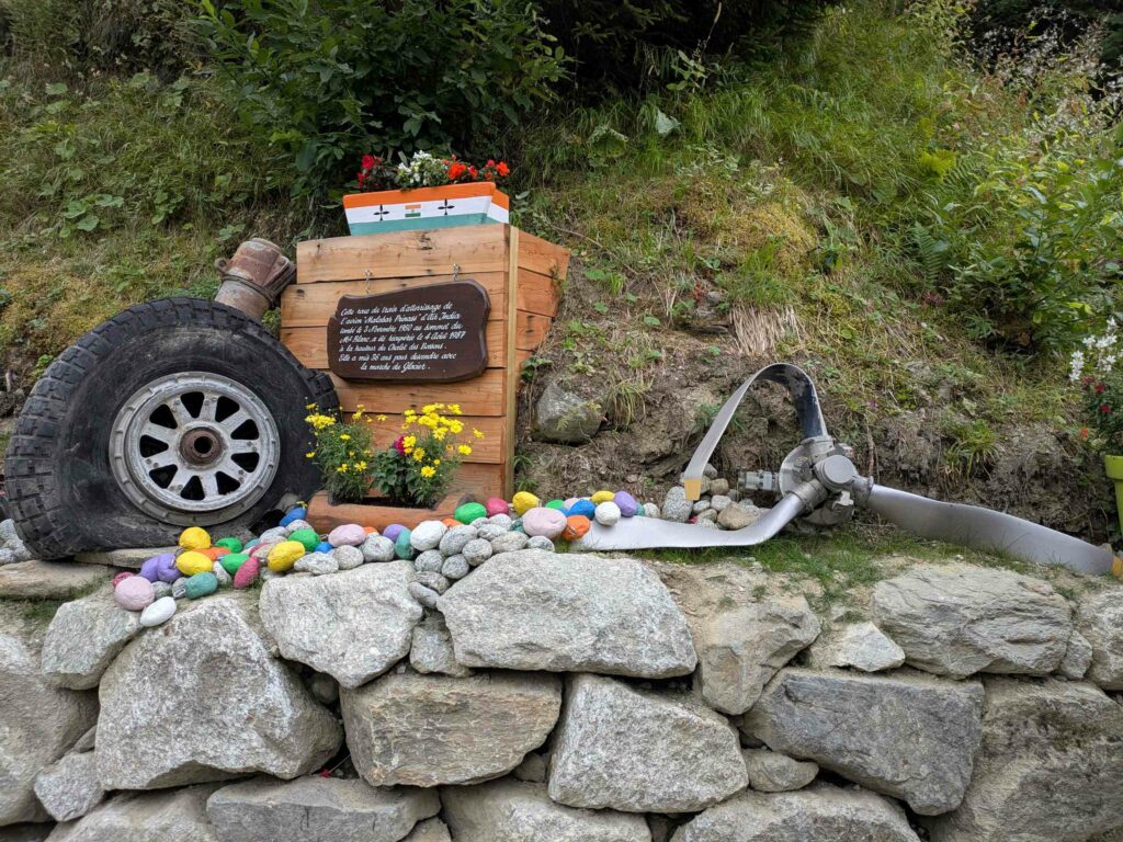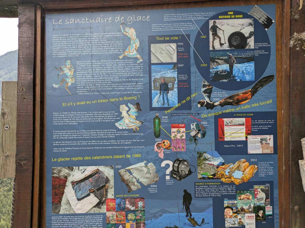 En attendant le 2ème groupe, nous nous installons pour siroter des boissons et visiter une exposition sous forme de sentier thématique avec des panneaux thématiques relatant l’histoire du crash du Malabar Princess. Ces panneaux décrivent le drame survenu le 3 novembre 1950, lorsque l’avion de la compagnie Air India, un Lockheed Constellation, s’est écrasé à 4 677 m d’altitude contre le rocher de la Tournette, dans le massif du Mont-Blanc, faisant 48 morts. Le chalet abrite également des éléments de l’avion, notamment la roue du Malabar Princess, qui est exposée, ainsi que des panneaux détaillant le tournage du film Malabar Princess sur les lieux du crash. Des débris de l’avion et des objets appartenant aux victimes sont régulièrement restitués par le glacier.