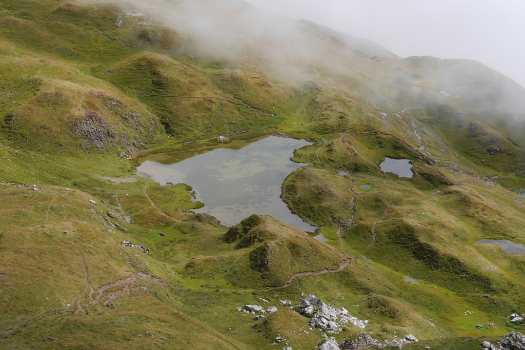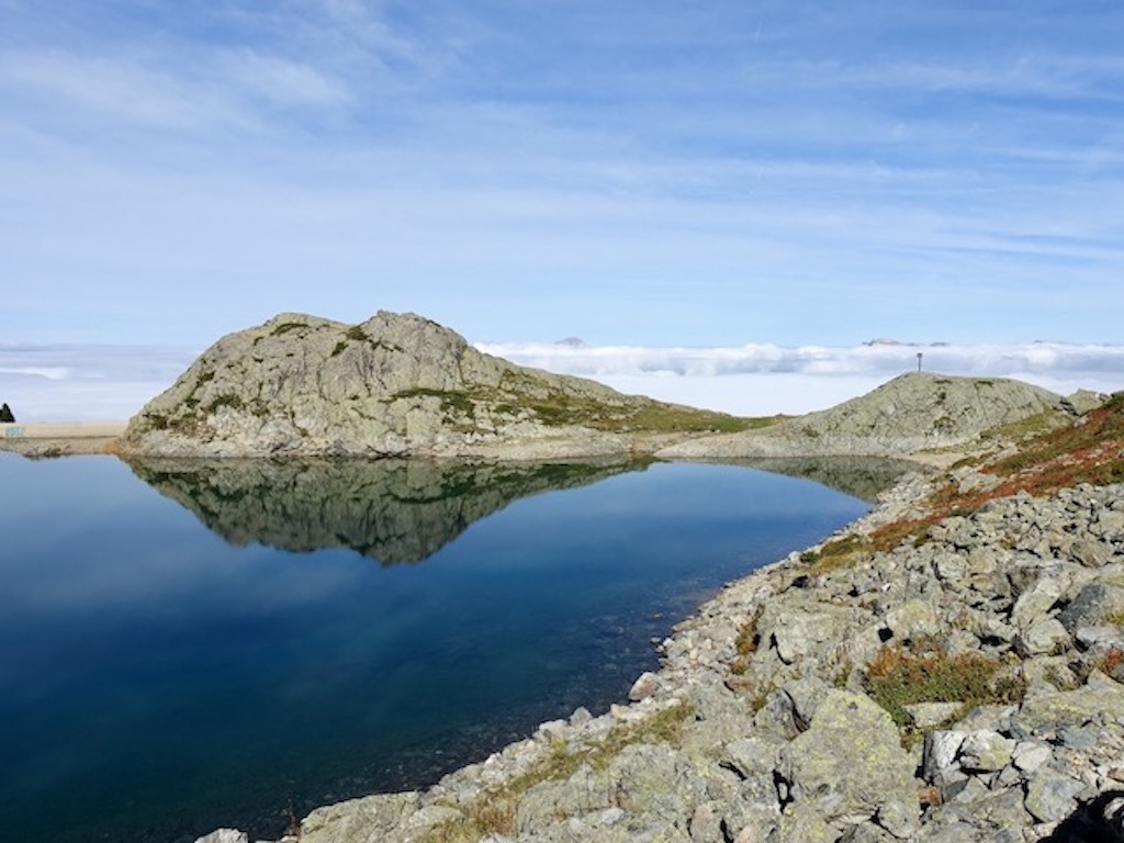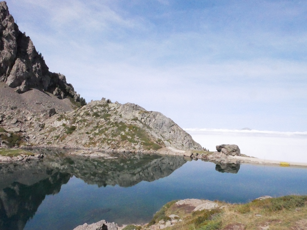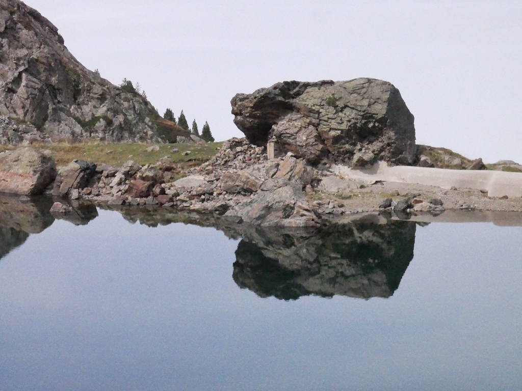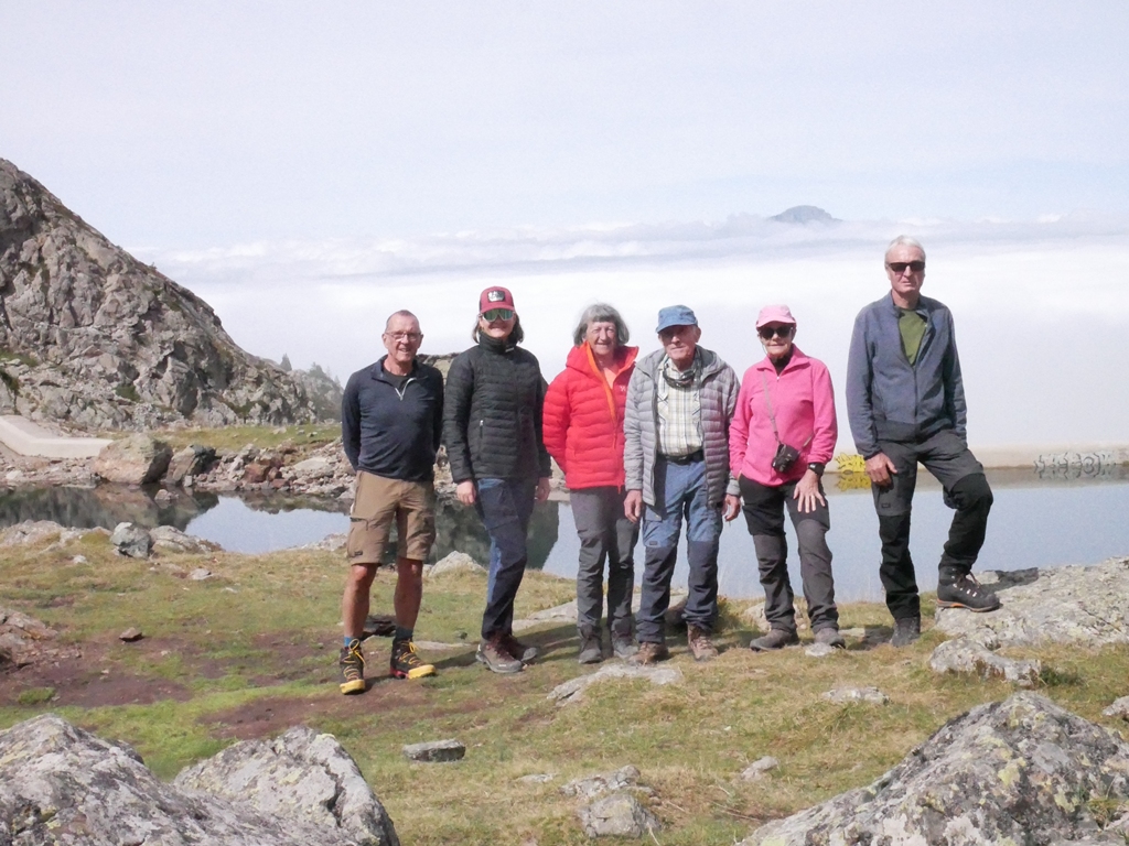 Le sentier est lui aussi capricieux, empierré puis boueux ou herbeux, ruisselant des dernières pluies, glissant… Daniel prend le rythme qui sied bien au terrain et après quelques pauses nous atteindrons sereinement vers 11h45 les bords du Lac de Peyre 2108m. Le lac est protégé par un cordon, ce qui nous rappelle qu’il vient d’être labellisé « Espace naturel sensible ». Il bénéficie d’ailleurs d’un plan de gestion spécifique depuis 2024 jusqu’en 2027
