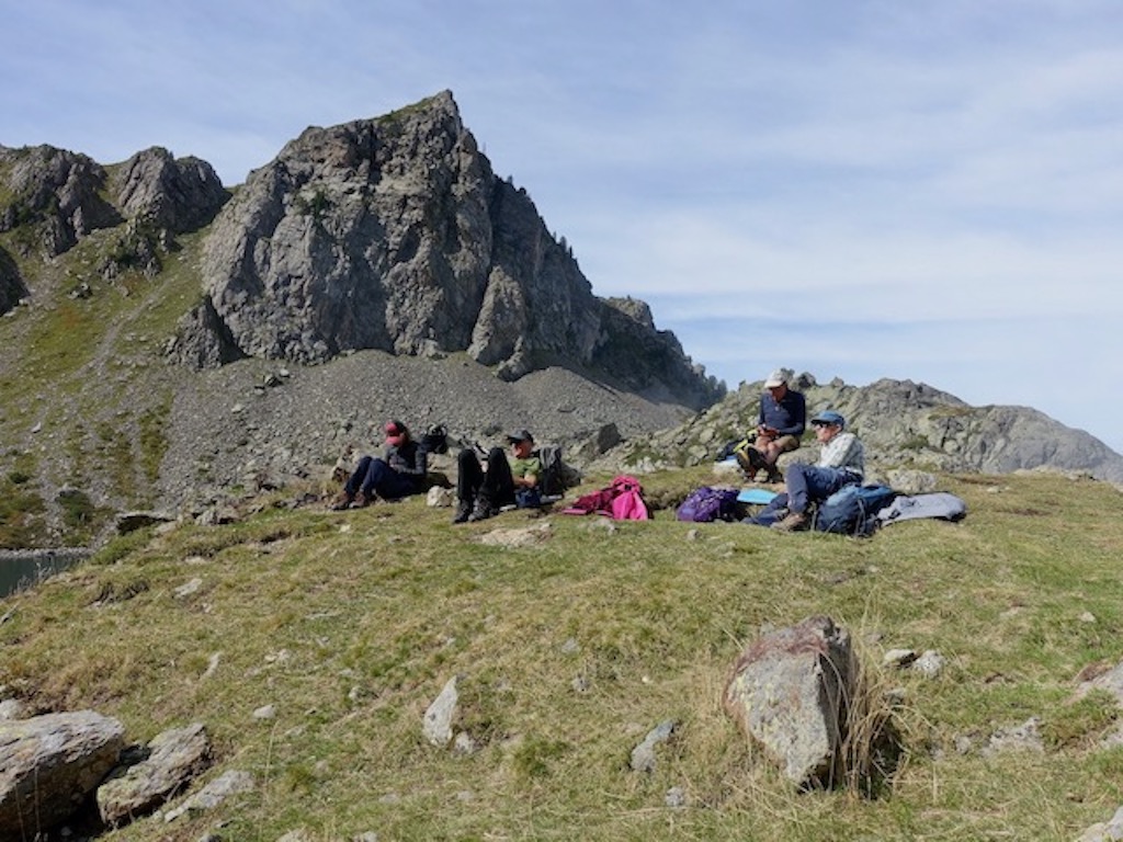 La pause méridienne est décidée, elle attendra pour 5 d’entre nous qui poursuivent jusqu’au col de Balafrasse 2246m. Les casse-croûtes sont tirés du sac et le premier groupe aura quasiment terminé son déjeuner lorsque tout le groupe sera réuni après l’aller-retour au col qui aura été réalisé en une petite demi-heure. Un petit Bandol rouge « Domaine La Suffrene », du raisin maison, un biscuit à la figue dont nous tairons la marque, un café accompagnent et complètent le repas de chacun.