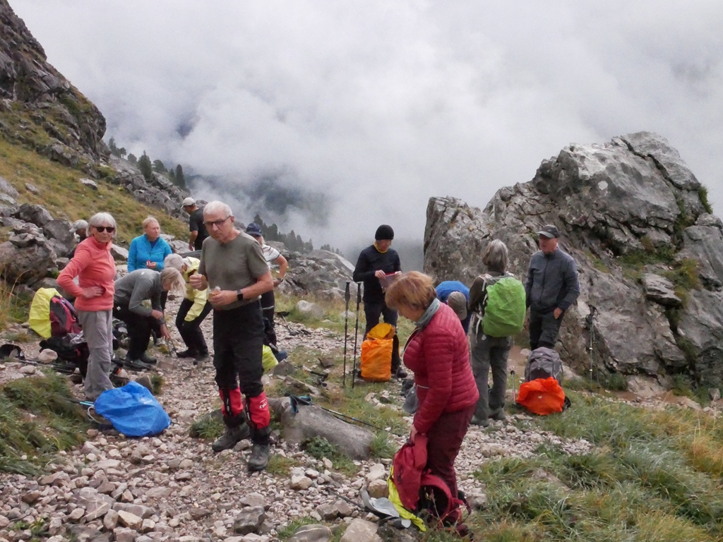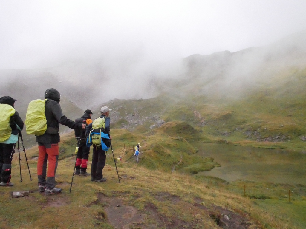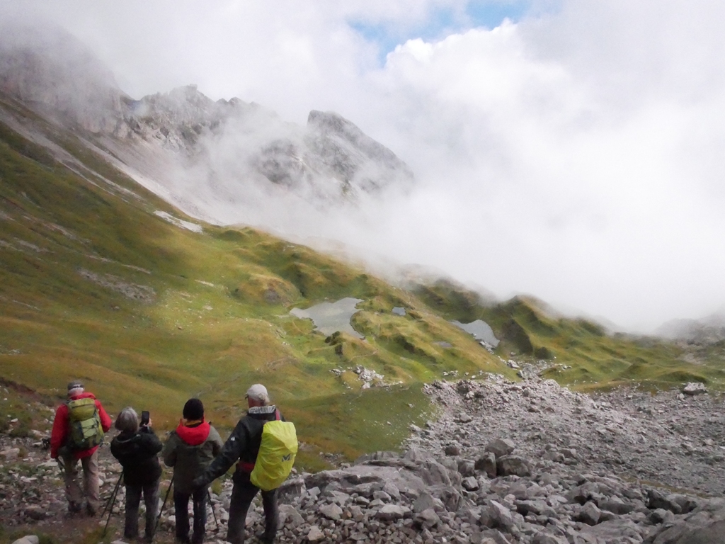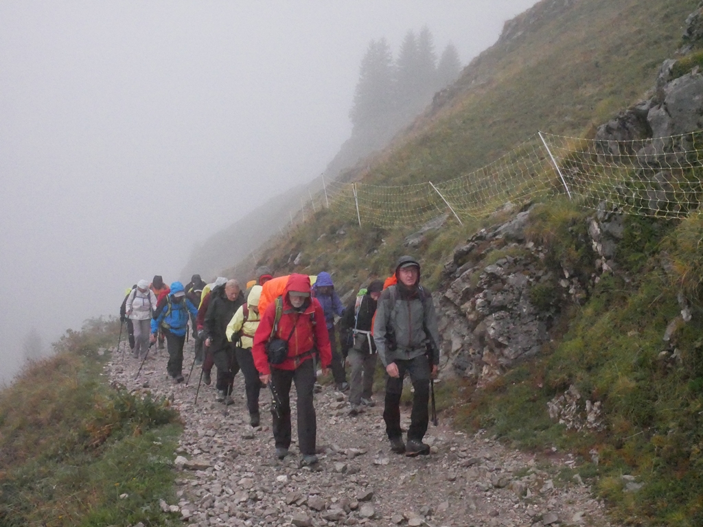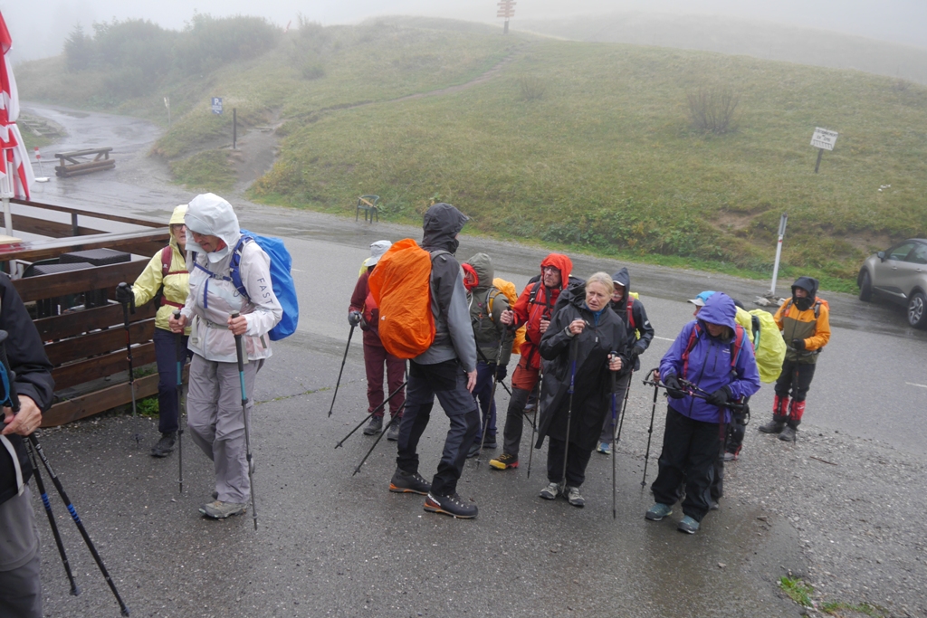 Qu’à cela ne tienne ! Ce sont 15 membres du club qui se regroupent à 8h00 pour rejoindre peu avant 9h00 le col de la Colombière. Point de difficulté pour le parking : nous sommes seuls ! La pluie fine, une fraîcheur certaine engagent chacun à mettre un vêtement de pluie voire deux pour ceux qui ont un surpantalon !