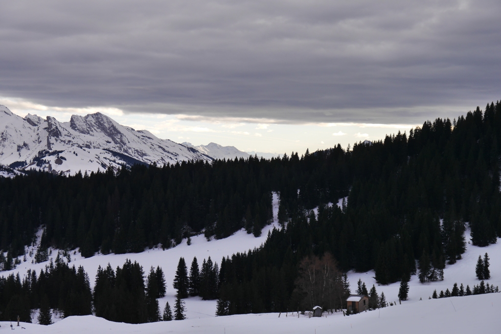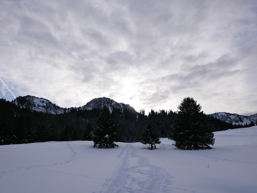Le ciel est couvert, les sommets alentours ne se présentent que partiellement à nous. Qu’à cela ne tienne nous finirons par les découvrir dans le courant de l’après-midi (chaine des Aravis, col des Aravis, plus au loin et qui restera couvert le massif du Mont-Blanc).