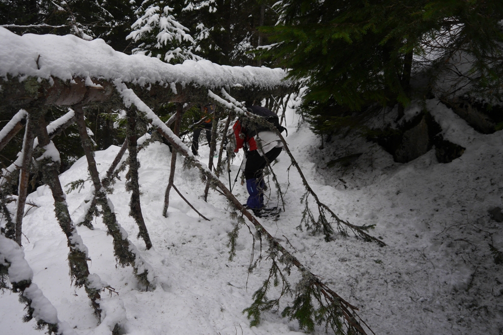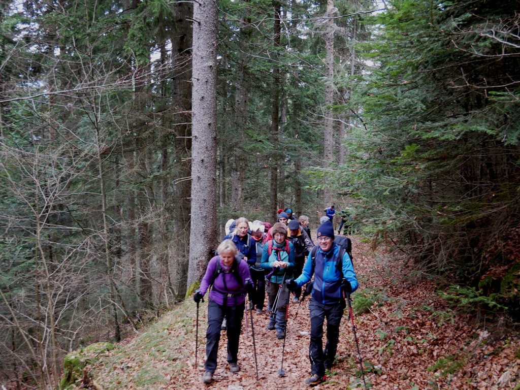 Nous franchissons le bois qui nous permet de rejoindre le pas du Loup vers 11h00. L’itinéraire sur lequel nous guide Gérard est semé d’embûches, la neige et le vent de ces dernières semaines ont couché de grands arbres qui nous rappellent que la nature conserve ses droits.