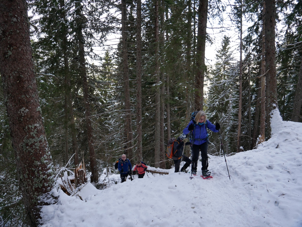 9h30 nous sommes au point de départ, bien équiper pour le froid et la neige. C’est raquettes aux pieds – une fois n’est pas coutume – que nous quittons la petite Métralière en empruntant le sentier qui traverse « Vers le Creux » alors que nous voulons aller vers le sommet ! Le site des Glières est bien actif, les fondeurs poussent sur les cannes, les randonneurs déjà loin pour certains qu’ils soient de Marche en Fillières ou de Metz-Tessy… Quelques solitaires à ski ou en raquettes ont pour seul compagnon un canidé qui doublera les kilomètres de son maître par des allées et venues en tous sens.